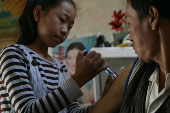 為了省錢,他們舍不得到醫(yī)院治療,陳長青8歲時就從醫(yī)院里學(xué)會打針換藥,擔(dān)當(dāng)起爸爸的“專職護士”,每天吃藥打針都在家里進行。現(xiàn)在,陳士泉的糖尿病引起的并發(fā)癥越來越多,最嚴重的腎衰竭,只能每天用藥養(yǎng)著。每隔4個小時就得換一次透析液,每天打3次胰島素,輔助藥物10多種,每天費用近300元,陳長青原來飄逸的馬尾辮也被剪成短發(fā)為爸爸換成了兩天的藥物。5年來,陳長青基本重復(fù)著一個生活流程:每天早晨5:30起床燒開水,用暖水袋將透析液溫至人體溫度,給爸爸灌透析液;然后,給爸爸在胳膊上打一針胰島素,看著爸爸將各種輔助藥吃完;接著,背著書包到離家3里地的學(xué)校去上學(xué);中午與下午放學(xué)回家后,再重復(fù)著早晨的動作,給爸爸打針換藥。懂事的她,常常在學(xué)習(xí)之余,幫助74歲的爺爺?shù)睫r(nóng)田里干農(nóng)活,幫助72歲的奶奶在家里燒火做飯。