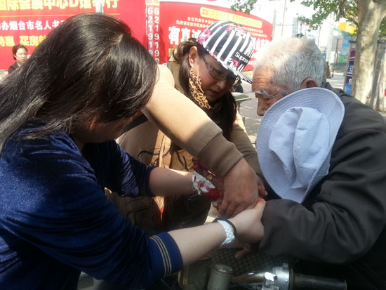 2014年5月12日上午九點,西大街和海港路交叉路口出現“奇怪”的一幕:綠燈放行了,一位白頭發老者,推著一輛三輪摩托車站在路口一動不動。一分鐘,兩分鐘,堵在老人身后的公交車司機有些按捺不住,“嘀、嘀”地按著喇叭。這大叔怎么不挪步呀?突然老人身體朝車頭位置仰去,老人倒在地上,左手小指和無名指兩根手已經在摔倒時生生被折斷,僅一點點皮肉連著,血不停地往身下滴。快點!快點!”幾乎同時,兩位站在人行道上的女士,飛奔到受傷摔倒的老人身邊。“快拿紙來!誰包里有紙!”一位年齡大概30多歲,頭戴斑馬紋鴨舌帽的女士上前一手掐住老人手腕,一邊仰頭問圍上來的路人。“我這兒有!”一位扎著馬尾辮的姑娘趕緊翻包抽出紙巾遞來。“快!打120!”“我打!”“馬尾姑娘”馬上撥打急救電話。此時,老人好像摔懵了,瘦小的身體不停地顫抖著,眾人將老人扶起。 “家是哪的?打電話聯系家人!”“馬尾姑娘”詢問老人子女的電話,不停打電話聯系老人的親屬。“你以后千萬別再騎這個車了,太危險了!”“鴨舌帽”按著老人滲出鮮血的手,心疼地說。看著老人手指鮮血直流“馬尾姑娘”傷心的哭了。 “來了來了!救護車來了!”,醫護人員到達現場馬上給老人包扎了傷口。“馬尾姑娘”隨著救護車一同去了醫院,圍觀的市民紛紛贊嘆道,“煙臺姑娘好樣的!”“應該的,誰遇到了都會伸把手的。”“鴨舌帽”說。整個救人過程“馬尾姑娘”和“鴨舌帽”一直配合默契,記者也以為她們倆人是好朋友。“你那個朋友是哪兒的?”記者向這位“鴨舌帽”打聽道。“我不認識她!我們都是路過的。”