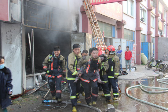到達現場的官兵迅速查明情況。起火的商鋪分為三層,一層是商鋪,二層三層用于居住。時間就是生命,馬志鵬決定,將救援人員分為三組,一組利用消防水槍從南側對火勢進行控制,防止火勢繼續蔓延;一組利用消防拉梯進入建筑內進行搜救,確定被困人員位置,進行救援;一組負責滅火供水。馬志鵬親自帶領搜救組攜帶救援器材進入現場,由于現場濃煙籠罩,能見度太低,搜救人員只能進行逐房搜索,終于在三樓一間房間內找到了這兩人。為了節省救援時間,救援人員在孩子身上系上安全繩索,由消防戰士將孩子通過拉梯從三樓窗口抱至地面。同時,馬志鵬摘下呼吸面罩,戴在被困婦女臉上,背起被困婦女,冒著濃煙經由建筑內部樓梯快速撤離現場,挽救了兩條生命。