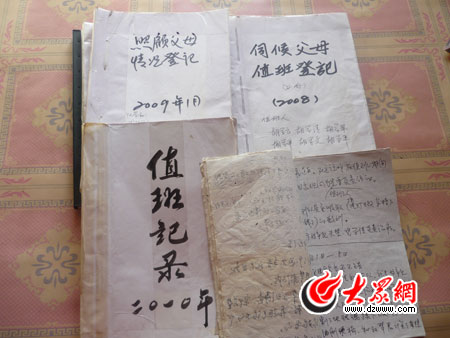 從2005年起,他們開(kāi)始記錄《孝敬父母值班筆記》,《值班筆記》上詳細(xì)羅列了值班人、時(shí)間、本月給父母購(gòu)置的東西、錢(qián)數(shù)、值班期間父母飲食生活怎樣、身體精神怎樣、值班人做了哪些工作(指生活調(diào)劑、衛(wèi)生等)、向值班人提出要求等條目,每一條都記錄的非常認(rèn)真詳細(xì)。《值班筆記》卷首寫(xiě)著“兄妹之間要團(tuán)結(jié)和睦,不斤斤計(jì)較,能相互諒解,相互支持,贍養(yǎng)好伺候好老人、以實(shí)際行動(dòng)來(lái)報(bào)答父母的養(yǎng)育之恩”。胡成樂(lè)的七個(gè)兒女,年齡最大的已年過(guò)70,最小的也40多歲了。但九年來(lái),不管因?yàn)槭裁丛,他們從未“空過(guò)崗”,誰(shuí)有事忙不開(kāi)了,其他兄弟姐妹都會(huì)爭(zhēng)著來(lái)代班。2007年,胡家兄妹又進(jìn)一步完善了伺候父母的措施,將其整理成《伺候父母過(guò)好晚年生活》的照顧指南,人手一份,里面著重指出每人都要帶著笑臉值班。說(shuō)起“帶著笑臉”,大哥胡學(xué)云說(shuō):“父母為我們辛苦操勞了一輩子,把我們培養(yǎng)成社會(huì)需要的有用之才,功不可沒(méi),現(xiàn)在他們老了,我們更應(yīng)該尊敬他們,不管發(fā)生什么事,回到家都要笑臉相迎,絕不給父母甩臉子,這一點(diǎn)我們都互相監(jiān)督”。