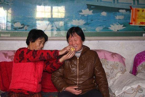 陳愛云和劉沒學(xué)做鄰居已經(jīng)十年,在陳愛云眼里,劉沒學(xué)是個讓人心疼的“苦命人”。因為小時候大腦受到損傷,劉沒學(xué)走路只能靠半邊身子帶動往前一步步挪,語言系統(tǒng)也有障礙,情緒一激動,話就說不清。天降橫禍,兩年前丈夫意外去世,劉沒學(xué)只能和9歲的兒子相依為命。怕劉沒學(xué)看不開,陳愛云三天兩頭往她家里跑,一邊流著眼淚一邊勸導(dǎo)她,讓她為了孩子說啥也得好好活下去。劉沒學(xué)不吃不喝,陳愛云就想辦法把她誆到自己家來,說是讓她過來幫忙做些力所能及的農(nóng)活,等她來了,陳愛云就把熱騰騰的飯端到她面前。就這樣,一天天的陪伴,一句句的安慰,一點點的幫助,劉沒學(xué)逐漸從陰影中走了出來,有了活下去的信心。