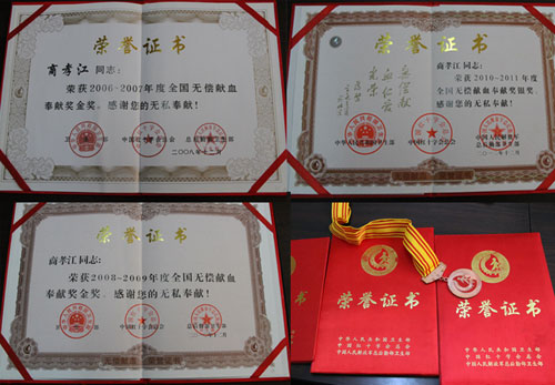生活中的商孝江不善言辭,卻是一名熱心公益的愛心市民。他家里有28本獻血證,見證著他十多年如一日的愛心奉獻的歷程。“人的一生總得為社會做點啥。”商孝江總是把這句話掛在嘴邊,這也是他執著于獻血的動力所在。如今,他累計獻血已達60多次,獻血量30200毫升。多次被國家衛生部授予無償獻血金獎、銀獎,被山東電視臺稱為山東最美城管大叔。