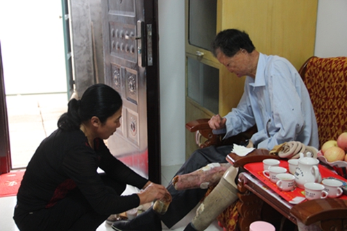 俗話說:夫妻本是同林鳥,大難來時各自飛。孫會敏卻用26年的堅持,給丈夫一個堅實的依靠。由于她丈夫燒傷十分嚴重,面部、頭部、胸口、雙臂、雙腿被火侵蝕的焦黑且已化膿,為防止感染,孫會敏每天都要花費幾個小時為丈夫清洗創(chuàng)面、消毒、上藥、包扎。為了減少丈夫的疼痛,孫會敏每次為丈夫擦身換藥時都是小心翼翼,先用鑷子將紗布揭開,再換上新藥重新將傷口敷好。藥換完后,孫會敏都會緊張得出一身大汗。