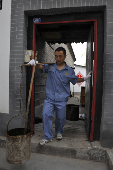 于海負責的三班,負責泉城路芙蓉街片區的家庭廁所糞便清運工作,由于芙蓉街是濟南老城區,古建筑比較多,又是著名的小吃一條街,餐館林立,流動人口多,人員稠密,廁所出糞量大,量小的廁所出糞量都在10挑以上,為了不耽擱居民使用,不管是數九寒天,還是烈日炎炎,無論是刮風下雨,還是雪天路滑,每天早上5:30,于海準時出現在服務地段,為居民清挖廁所。