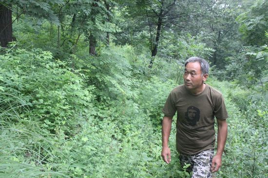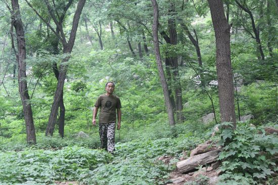 陳貴貞的老家在離長峰山不遠(yuǎn)的泗水縣圣水峪鎮(zhèn)安德村。1984年秋天,初中畢業(yè)還不滿17周歲的陳貴貞被安排到了國有黃山林場工作,分配到長峰峪林區(qū)擔(dān)任護(hù)林員。他暗下決心要干好工作,然而,對一個不滿17周歲的孩子護(hù)林工作還是有些吃不小。當(dāng)時林區(qū)的護(hù)林員輪流值班巡山,陳貴貞最小,離家遠(yuǎn),生活沒法保障。每次巡山回來又累又餓,連休息的地方也沒有。陳貴貞決定搬到山上住,房子簡陋,他就自己動手,起石頭、割黃草,自己壘墻,硬是把房子修好,解決了后顧之憂。"我的工作其實就是巡山護(hù)林,每天到林區(qū),看看樹木情況、有沒有火警。陳貴貞嘴里這份簡單的工作,三十年來并沒有太大的變化,與深山和樹林為伴,工作在護(hù)林一線,在平凡中書寫著堅守的精彩。剛工作的時候,林區(qū)有三名護(hù)林員,由于工作艱苦又單調(diào),一批又一批年輕人到過長峰峪當(dāng)護(hù)林員,都沒堅持太久,最后剩下了陳貴貞一個人。巡山匯報,是陳貴貞每天的必修課。方圓數(shù)十里的山頭,對他來說早已是駕輕就熟。夏天頂著烈日,冬天冒著寒風(fēng),每次進(jìn)山,他都要帶幾個饅頭、幾棵蔥、一包咸菜,渴了,就喝巖縫里的山泉水,中途遇到下雨,就找個山洞躲一躲。一年四季,他敏銳的目光都在山林間注視著,哪怕是小小的飛蛾,也要查看會不會威脅到林木。