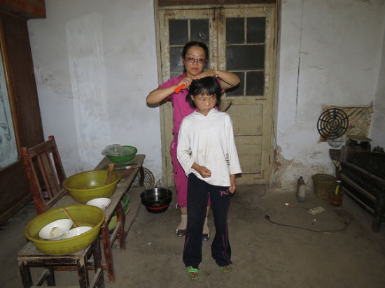 張俊在為這個(gè)有輕微自閉癥的孩子梳一個(gè)漂亮的辮子。