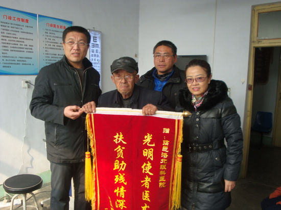 眼睛復(fù)明的何志玉老人送來錦旗。右一為張俊。