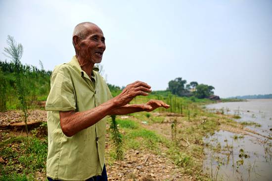 高元珍老人在河邊向記者回憶當(dāng)時救人的場景