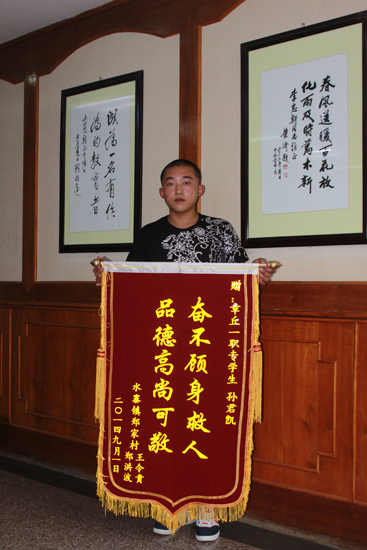 2014年9月2日是一職專新生開學的日子。當天上午8:30,機電專業新生孫君凱報名后卻又被“召回”學校辦公室。原來,是他在暑假里救起的鄰村兩名少年的家長把錦旗送到了學校里。