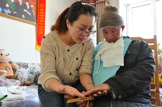 刷過牙后,張茂林在張慧的攙扶下,慢慢站了起來,拄著扶手挪動幾下腳步,燦爛的笑容灑在臉上。父親雖然漸漸醒過來了,但是智力卻跌落在了四五歲的水平,由于腦部受傷,手腳無力。學(xué)過醫(yī)學(xué)的張慧堅信,只要認(rèn)真護(hù)理,父親會慢慢好起來。父親住院的時候,醫(yī)生使用針灸治療,張慧在一旁一邊幫忙一邊學(xué)習(xí)。父親出院后,張慧自己給他針灸,一堅持就是7年。她先在自己身上試針,找穴位、找經(jīng)脈,由于扎錯了穴位,弄壞了嗓子,至今說話聲音嘶啞。