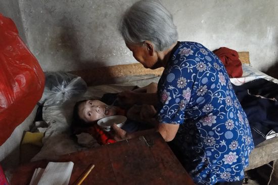 經(jīng)過了漫長的求醫(yī)之路,徐福寨的病情一直沒有好轉(zhuǎn),終年在床上躺著,身體不能直立,不會說話,只會發(fā)出"啊,啊"的聲音,但田文英夫婦憑著音調(diào)的轉(zhuǎn)換能聽懂兒子在"說"什么,是渴了、餓了、尿床了、生病了。就這樣日復(fù)一日,年復(fù)一年,田文英夫婦每天的任務(wù)就是燒飯、喂食、擦澡、洗衣、下地勞作,為這一個病殘的兒子,夫婦倆一輩子沒睡過幾個安穩(wěn)覺,沒敢出過一趟遠(yuǎn)門,三鄉(xiāng)五里的走趟親戚也不敢留下來吃飯。