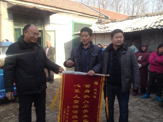 12月23日上午,張洪勝家門前響起一陣清脆的鞭炮聲,同村村民呂芝明與村"兩委"干部走進(jìn)張洪勝家中,將兩面寫有"舍身救人不畏生死,心系兒童情潔德高"和"奮不顧身,舍己救人"的錦旗,送到本村村民張洪勝的手中,連聲感張洪勝不畏嚴(yán)寒勇救落水兒童的義舉。