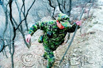 龍洞林點地處深山,在上個世紀末到本世紀初,手機沒信號,收音機也是時斷時續(xù),十天半月的一個人見不到是常有的事,這種極度的孤單寂寞一般人同樣是難以承受。雖然孤獨,也沒有人監(jiān)督,老劉仍然堅持每天巡山。巡山的裝備就是:背包、收音機、對講機,多數(shù)情況下還跟著一條狗。背包里背著他的午飯和水,夏天是饅頭和涼菜,冬天是煎餅和咸菜,因為冬天帶饅頭會凍成冰疙瘩。龍洞林區(qū)涵養(yǎng)的是大量側柏林和部分針闊葉混交林,相當易燃,一旦起火,后果不堪設想。巡山的主要任務是防火。為了山林安全,只要不是雨雪天氣,老劉每天早上7點多就出門,下午兩點后才回林點休息。中間在山上吃午飯。他給自己安排了兩條巡山線路,每天走一條,大致兩天能把轄區(qū)走一遍。他經常勸阻進山人用火,一旦發(fā)現(xiàn)火情,立即采取措施處置,并第一時間上報。每年11月初至次年6月底是林場火情高危期,這期間,老劉基本不安排休息日,逢年過節(jié)也堅守崗位,其他月份他通常一個月回長清老家一次。在那些家家戶戶團圓歡聚的日子里,劉采法依舊獨自守在林點,照常帶著干糧巡山,多少年沒回家過除夕,他自己也記不清了。巡山的任務還有勸阻和制止損壞和侵占林地現(xiàn)象,這方面,老劉這么多年也做了很多工作。