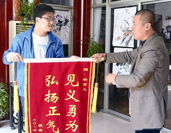 由于搶救及時,慕香峰夫妻很快脫離危險,但感恩的心讓他們無法釋懷。"必須要找到救命恩人,當面說聲謝謝。當時天氣冷,行人又少,如果他不出手相救,我們真的是兇多吉少。"慕香峰說。他和妻子出院后四處尋找救命恩人,最后通過查找當時的報警電話才找到了楊育凡。第二天,慕香峰把寫有"見義勇為,弘揚正氣"的錦旗送到楊育凡手中,表達對救命恩人的感激之情。而楊育凡卻淡然地說:"誰遇到那種情況,都會出手相救的,我只是做了一件應該做的事。"