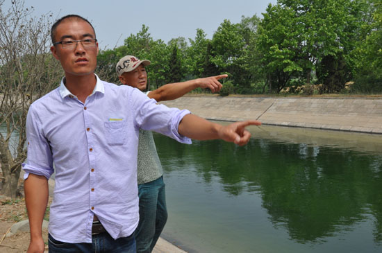 此時(shí),在河堤南側(cè),35歲的牛兆科和他42歲的舅舅王臣誠正在給自家魚塘安裝增氧機(jī)。牛兆科突然聽到一聲尖厲的急剎車聲,緊接著他看到一陣塵土飛揚(yáng),一個(gè)巨大的水花濺了起來。“壞了!有車掉河里去了!”牛兆科第一時(shí)間反應(yīng)過來,他抓起旁邊的尼龍繩和一個(gè)耙子,喊起正在幫忙干活的舅舅王臣誠,一路快跑沖上河堤。