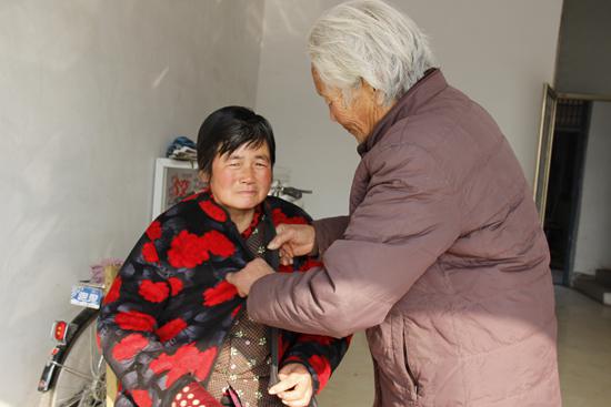 在六和苑社區(qū)一個(gè)商品樓內(nèi),冬日暖陽透過玻璃斜斜地灑在一對(duì)婆媳身上:76歲的婆婆孟秀銀滿頭銀發(fā),不時(shí)地幫兒媳整理著衣服;44歲的兒媳褚桂珍低頭看著婆婆,沒等開口說話就先笑了起來。