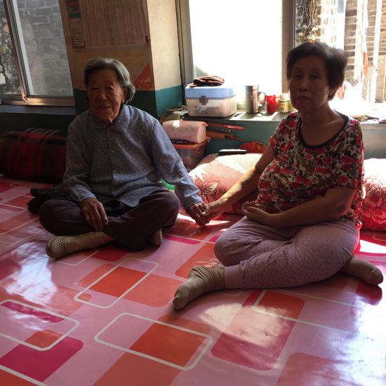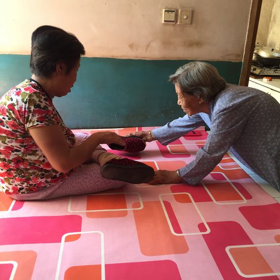 林鳳英老人幫助癱瘓的小兒媳婦李紅穿鞋襪