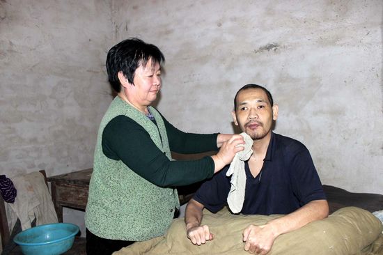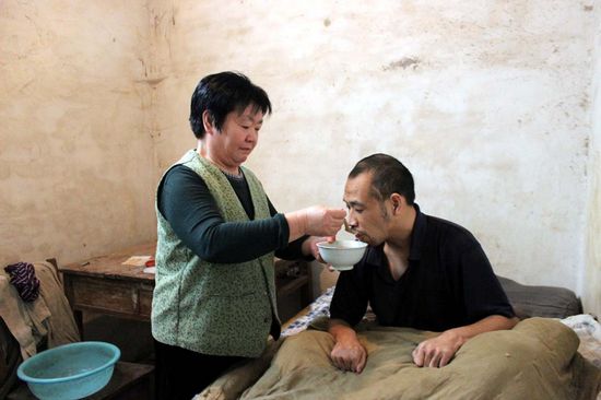 2002年,趙玉蘭退休,可以專心伺候?qū)O源了。然而,幸福在2009年12月13日戛然而止。這天,孫源獨(dú)自過馬路時,被一輛疾馳而來的轎車撞飛30多米,鼻子、嘴里都是血,左腿骨折,腦部中度腦震蕩,時而清醒時而糊涂,加之右腿自小無力,只能臥在床上了。自那以后,趙玉蘭再也沒有清閑過,沒睡過一個安穩(wěn)覺,哪里也去不了。起來一天陪他說話、喂飯喝水、按摩、換尿布,一步也不能離開。“看著孩子這樣,咱受點(diǎn)苦累都不要緊,只要我活一天就照顧孩子一天!”趙玉蘭說。