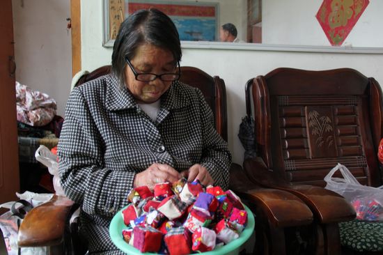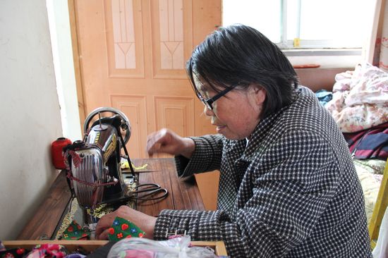 生活的艱難使得蘆月云每天要面對(duì)很多的挑戰(zhàn),兒子在外地定居生活,女兒的出嫁,老伴的去世使得家里只剩下了自己,對(duì)于日常的生活蘆月云現(xiàn)在顯得駕輕就熟。雖然自身殘疾,但是蘆月云經(jīng)常笑著說自己和那些健康的人一樣,不需要照顧。在蘆月云的心中,她始終記得自己的親人經(jīng)常交代給自己的事情:要對(duì)社會(huì)抱有一顆愛心。雖然身體殘疾但是蘆月云是村里遠(yuǎn)近聞名的“熱心腸”,蘆月云做衣服的技藝精湛,鄰居們便經(jīng)常拜托給蘆月云做一些小孩的衣服,蘆月云每次都笑呵呵地接受。有一次給村民做衣服時(shí)留下了不少的布料,蘆月云看著挺可惜,便萌發(fā)了做沙包的念頭,“我看周圍的小孩每天在大街上跑,沒有玩具可玩,就想著給孩子們做一些沙包玩耍,慢慢的,做沙包成為了我每天的工作。”蘆月云笑著說。