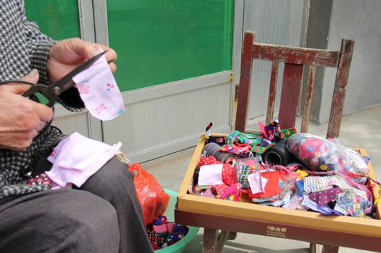 蘆月云正在裁剪做沙包的布料,這些布料是蘆月云自己在集市上購買的
