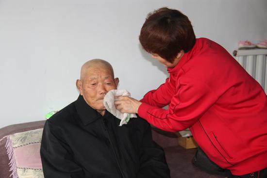 今年已90歲高齡的尚禮乾老人是位抗戰(zhàn)老兵,先后參加了濟(jì)南戰(zhàn)役、淮海戰(zhàn)役、渡江戰(zhàn)役等。后來(lái),在解放平川島戰(zhàn)役中,老人負(fù)傷致殘。1950年復(fù)員回家,沒(méi)有子女的他一直獨(dú)自生活。1990年,牛國(guó)紅嫁到大尚村尚金忠家。在得知尚禮乾無(wú)依無(wú)靠后,她主動(dòng)要求把老人接到自己家,開始了長(zhǎng)達(dá)二十四年的悉心照顧。“我伯父一輩子為解放戰(zhàn)爭(zhēng)流血流汗,還負(fù)了傷,我不能讓他老了孤苦伶仃一個(gè)人。”牛國(guó)紅滿含淚水的說(shuō)。