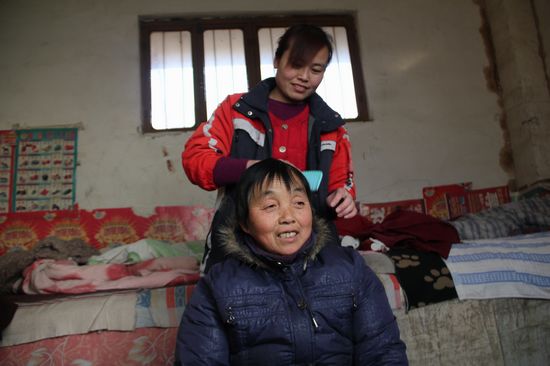 2007年婆婆身患抑郁病,吃不下飯,胡思亂想,四處亂跑,整個人瘦的不到90斤,每天蘇月英既要做飯、做家務,又要照看好家里面的兩個老人和一個小孩。她時常在安頓好奶奶后,抱著兒子,領著婆婆,四處尋醫看病。在她的精心照料下婆婆的病終于有了好轉。