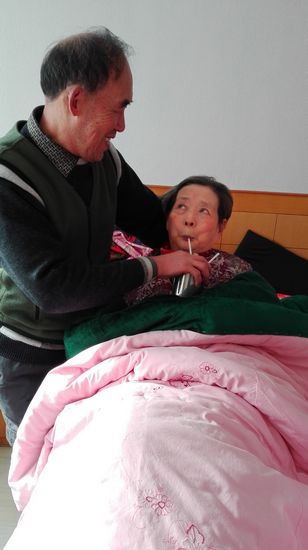 連夕慶從一個從不做家務的人,學會了洗衣、做飯、縫補等各種家務。平日里,連夕慶做面條、餃子、包子等各種面食,每天做不同的花樣。妻子牙齒不好,他就去買了豆漿機,讓她每天能喝上新鮮的豆漿補充營養。擔心病床上的妻子躺久了血脈不通,連夕慶堅持每天早、中、晚各扶起妻子坐1個小時。三回穿、三回脫,一年365天,穿脫就是2190回。天氣好的時候,連夕慶還會將妻子抱到輪椅上,推著妻子到村里的廣場曬曬太陽。夏天洗澡、冬天擦身、勤換被褥,連夕慶對妻子的吃喝拉撒照顧得無微不至。30年來,妻子從沒有得過褥瘡、生過濕疹。