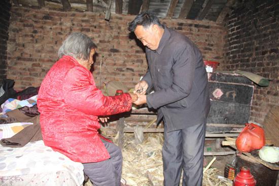 “不知道乃現圖什么,一個孤老婆子無依無靠,還有點老年癡呆,全憑著政府給的一點低保勉強度日。”面對村里人的質疑,劉乃現說:“我不能看著她有困難不管不顧,老太太的丈夫是老黨員、老保管,為村集體經濟出了不少力。我作為村里的黨員干部,理應照顧孤寡,有錢我出錢,沒錢我出力,我啥都不圖,就圖個心安。”