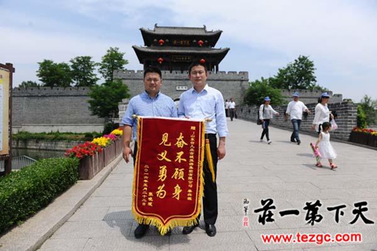 ?? ? 第二天,落水兒童的父親張先生專(zhuān)程來(lái)到臺(tái)兒莊古城向秦興磊贈(zèng)送錦旗。他說(shuō):“當(dāng)時(shí)要不是秦哥這么及時(shí)的話,后果真不堪設(shè)想。孩子在水里,秦哥過(guò)去一把把她托起來(lái)了,和現(xiàn)場(chǎng)的好多好心人一起把孩子救上來(lái)了,所以也是特別的感謝秦哥。”。