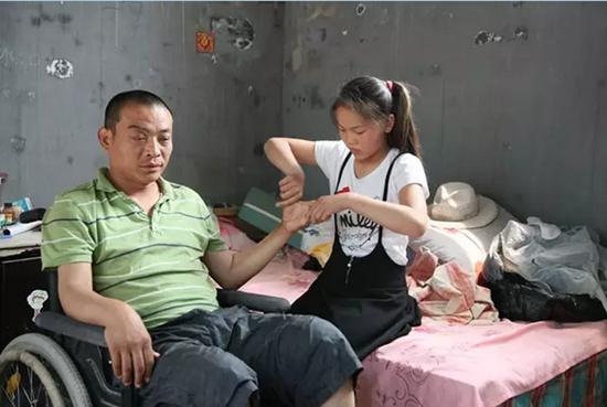 冰冰是第一個接受現(xiàn)實的。她不再抱怨,而是默默地為父親按摩、捶背,幫父親做簡易的康復治療,將體重140斤的父親從輪椅抱到床上……小小年紀的她,幾乎能完成對父親所有的照料。