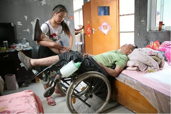 由于血液循環(huán)不暢,袁保軍的身體經(jīng)常發(fā)麻。這時,冰冰便為父親捶背和按摩,時間不長,冰冰頭上便沁出了細細的汗珠。