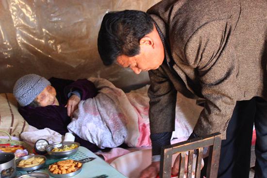王金星的岳母尤何氏97歲,老伴去世早,育有五個閨女,一個兒子,是一位經歷過太多苦難的老人:兒子不到二十去世,老人一下子失去了精神支柱,天天以淚洗面,一病不起,五個閨女其中兩個也相繼去世,現在的三個女兒一個在東北,一個在莒南,另一個就是王金星的妻子,患有股骨頭壞死常年有病在床。因為離老人最近,照顧老人的重擔就這樣落在了王金星身上。