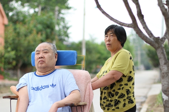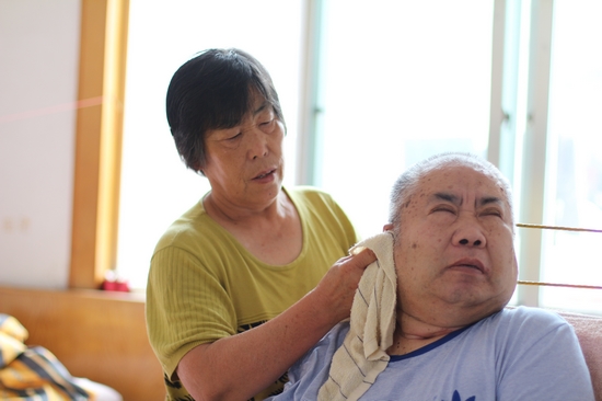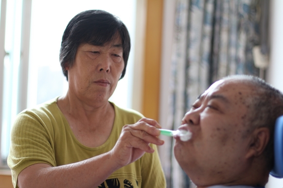 早上起床,先給劉瑞慶穿好衣服,然后把170多斤的劉瑞慶背到輪椅上,幫他洗臉刷牙、刮胡子,一切收拾妥當后,再一口一口地給他喂飯、洗漱……如果上午天氣好就用車子推他出去曬曬太陽散心,散心回家后劉瑞慶要么在輪椅上看電視,要么就讓嫂子把他背到床上休息。午睡后,郭希英再把他背到輪椅上在屋里和院子里來回轉轉。晚上,劉瑞慶需要有人不停地幫他翻身,為此,郭希英把床放在和小叔子同一個房間里,隨時照顧他喝水、大小便,幫他按摩、捶背……由于郭希英細心照顧,這么多年來,劉瑞慶的身上從未長過痱子和褥瘡。到醫(yī)院體檢時,連醫(yī)生都驚詫,這樣一位近四十年臥床的高位癱瘓者,身上沒有一點異味,內臟器官完全正常的。長年臥床讓劉瑞慶常常心理失衡,動輒發(fā)脾氣、甩臉子……這時,郭希英難過一陣后就轉為心疼:天天躺在床上不能動,他哪能沒有點火氣?!劉瑞慶大小便沒有知覺,讓嫂子幫著導尿排便,最初他極端難受難堪,甚至難過得直哭,可郭希英說,“你就是我兄弟,我不幫你誰幫?!你自己又不能!”劉瑞慶正常排便一次得一至兩個小時,一旦便秘就得三四個小時,最長的時5個多小時,每次便秘,郭希英就用手指一點點摳。在照顧的過程中,郭希英最擔心的是劉瑞慶感冒,每次感冒,劉瑞慶就會有痰,他自己使不上勁往外咳,很容易堵住氣管窒息,這時候,郭希英就寸步不離地守著,一看他有痰就跪在面前,幫助他按摩推拿腹部,借助著外力讓劉瑞慶努力使勁把痰咳出來。