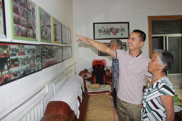 王強和老人們看著外出旅游的照片,充滿快樂的回憶。王強老家的墻上掛滿了和老人們在一起的照片