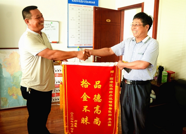 2016年7月7日,臨港區農業經濟發展局辦公室里上演著一幕感人場面,文登區市民江永將一面寫有“拾金不昧、品德高尚”的錦旗送給汪疃畜牧獸醫工作站站長李衛國,并再次表達感激之情。