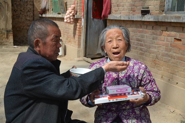 郭明林告訴筆者,養母患嚴重的冠心病,耳聾,記憶力也不好,平時都不知道該吃幾片藥,身邊離不開人,他天天得喂母親吃藥。