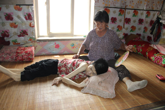 每天天不亮,趙桂蘭會起床,精心給女兒準備早飯,等女兒睡醒后,伺候她穿衣喂食,抱她方便后,便坐在女兒床頭,陪她聊天解乏,每隔一會就要為她換尿布。趁著女兒睡著,她還要涮洗尿布,抽空干點家務。即使是晚上睡覺,她也不能安眠,每夜總要起夜幾次,看女兒是否要上廁所,被子有沒有蓋好。趙桂蘭屋外面對是生活的重擔,屋里面對的是她癱瘓的女兒。每每看到瘦得皮包骨頭的女兒,她都忍不住心酸:“俺也想讓閨女出去曬曬太陽啊,可俺抱不動也背不動了!壁w桂蘭很心疼女兒,但卻心有余而力不足。