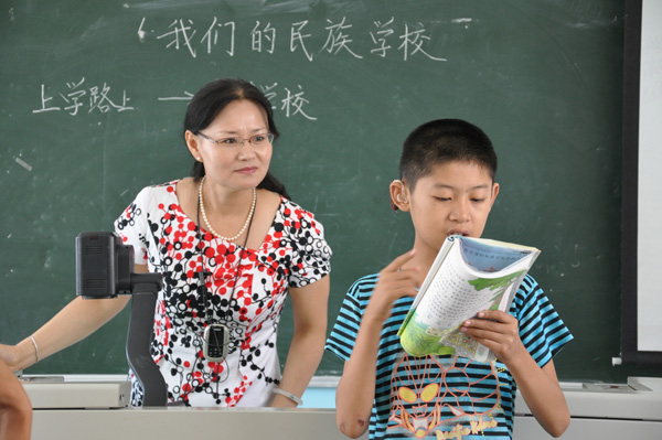 聽(tīng)障兒童教學(xué)艱辛的,每教一個(gè)音節(jié),都要讓學(xué)生細(xì)致地觀察老師發(fā)音的舌位、唇形的變化、觸摸聲帶的震動(dòng),感受氣流的強(qiáng)弱,一天三四節(jié)課,她常頭腦發(fā)脹;她曾為校外一個(gè)極重度聾的兩歲女孩進(jìn)行語(yǔ),反復(fù)地聽(tīng)辨,不停地講解,半年沒(méi)發(fā)音的她突然說(shuō)這是小鳥(niǎo)叫,這是火車的聲音……四年后這個(gè)小女孩順利進(jìn)入普通學(xué)校就讀。他在教學(xué)中發(fā)現(xiàn)了“課內(nèi)情景再現(xiàn)—課外鏈接生活”教學(xué)法,先后讓100多名學(xué)生開(kāi)口說(shuō)話、執(zhí)筆寫文,將一個(gè)又一個(gè)“星星”摘下來(lái),送給了他們的父母。