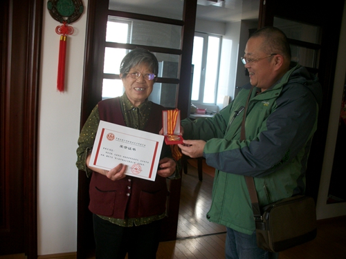 李致蘭(左)獲得了優(yōu)秀社區(qū)志愿者的榮譽(yù)稱號(hào),冠縣路社區(qū)書記將榮譽(yù)證書和勛章送到李阿姨家中。