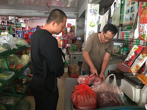 周積國(右一)在給顧客切肉稱斤