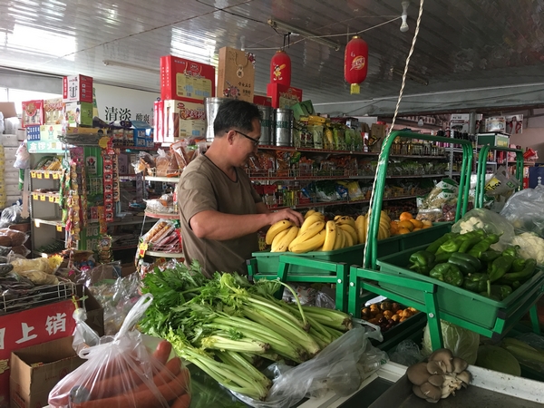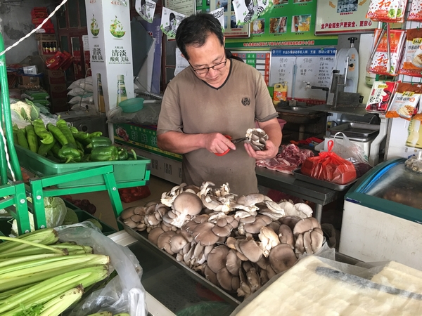 每天早上進完貨回來,周積國和妻子兩個人總是要先把蔬菜整理一遍,把一些不新鮮的菜葉摘掉,蘑菇總是把根部先拿剪刀剪掉。周積國說:“剪掉這些我損失不了什么的,但是村里的人來買的時候卻能方便很多,最關鍵的是把那些不好的東西賣給別人我這良心上也過不去!