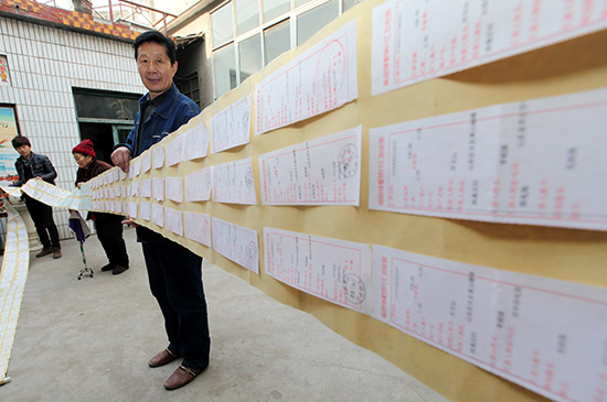 自1995年起他堅持每月從做農電工的工資中拿出100元錢資助貧困家庭。如今,為了方便保存,他把20年來保留的匯款收據有序排列粘貼在一起,形成了12米長的特殊“匯款單”。