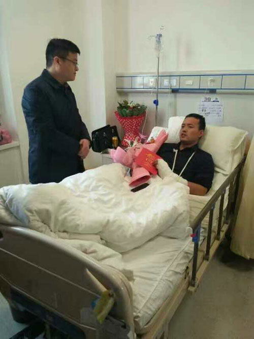 將三人成功救出,趙傳博用盡最后一絲力氣,從窗口跳向了一旁一輛車的車頂,又滑到地面上,基本失去了知覺。原來,在他用拳頭打碎玻璃時,左手肌腱被玻璃割斷,鮮血直流,當(dāng)時他只是覺得有些疼,因急于救人就沒有顧及。在救下人后,他因失血過多和濃煙刺激失去了知覺。