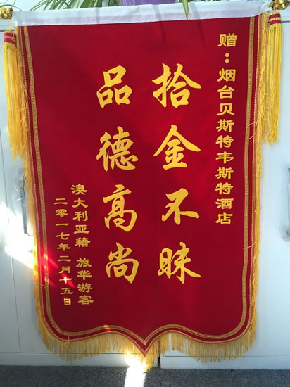 據(jù)了解,失主發(fā)現(xiàn)自己錢包不見后,一直以為錢包落在了媽媽家中,因此沒有主動(dòng)聯(lián)系酒店。當(dāng)她接到酒店的電話時(shí)驚喜萬分,拿到錢包后,一珠女士堅(jiān)持要拿出酬金答謝姜文紅和酒店,被姜文紅婉言拒絕了。無奈之下,一珠女士委托煙臺(tái)的朋友制作了“拾金不昧 品德高尚”錦旗表達(dá)謝意。在姜文紅本人看來一個(gè)最平常不多的舉動(dòng),卻真正見證了一個(gè)不染塵埃的靈魂。也見證了他一顆金子般的心,詮釋著誠(chéng)信的真諦。