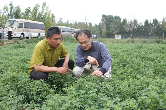 盛亦兵(右)在汶上老孟農場為農場負責人做苜蓿栽培技術指導