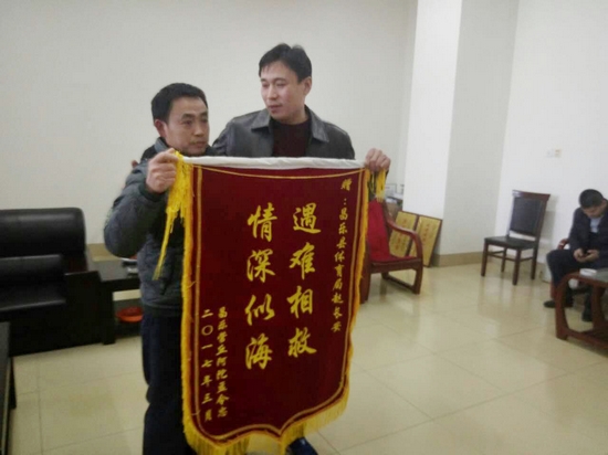 2017年3月8日下午,昌樂市民孟先生在朋友的陪同下,將一面寫有“遇難相救 情深似海”的錦旗送到了昌樂縣競技體育學校副校長趙長安的手里,說是要感謝自己的這位救命恩人。