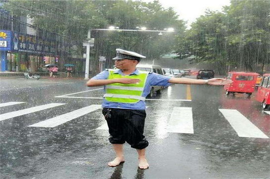 雨情就是警情,李虎和同事們緊急出動,一起在暴雨中指揮疏導車輛。當時,李虎所在的光明崗是縣城的交通繁忙路段,由于車輛行人較多,他和同事們不斷地幫助車主將拋錨車輛推出積水路段,疏導行人、疏通排水口,忙亂中腳上的鞋子不知什么時候走丟了一只。