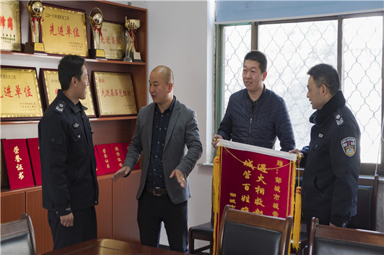 “如果當時沒有執法隊員的及時撲救,臨近停車場的新車肯定被燒,我還有很多貸款,根本賠不起,如果大火燒起來,我肯定就破產了,真是太感謝你們了!笔潞螅浇慕洜I戶帶著錦旗送到單位表示感謝,并對城管隊員們及時撲滅大火,避免了商戶的經濟損失,表示感謝。