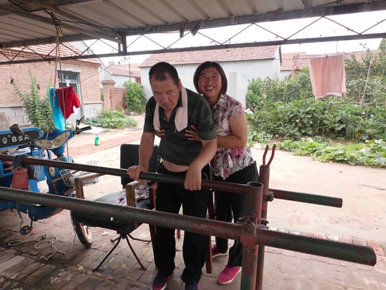 為了促進丈夫康復,孔令榮在家自制雙桿,幫助其活動。
