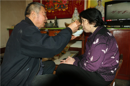 魏增玉家里有兩間居室:一間是臥室,一間是客廳兼餐廳,小小的居室被魏增玉打掃得干干凈凈,老伴兒雖然常年臥床,但是屋子里沒有半點兒異味。每天清晨,魏增玉早早起來,為老伴兒做飯、洗衣、清掃,然后伺候老伴兒起來坐一坐,給老伴兒洗臉、梳頭、喂水、喂飯。老伴兒坐累了,再扶著她躺下,躺夠了再起來,身體哪里不舒服了,魏增玉就幫她按摩、敲打。最難熬的是夜晚,老伴兒一個小時就得解一次手,魏增玉就一個小時起來一次,多年來,魏增玉的睡覺習慣已改變,隔一個小時準醒,就跟定了鬧鐘一般。有時候他出去忙村里的事情,老伴兒拉尿在褲子里,他回來就拎到院子里洗刷干凈。
